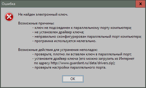 Решение: присоединить ключ, для которого хотя бы один раз устанавливалась запускаемая программа (см. выше «Особенности работы») → [если не поможет, то] → переустановить программу* → [если не поможет, то] → Возможная причина №2