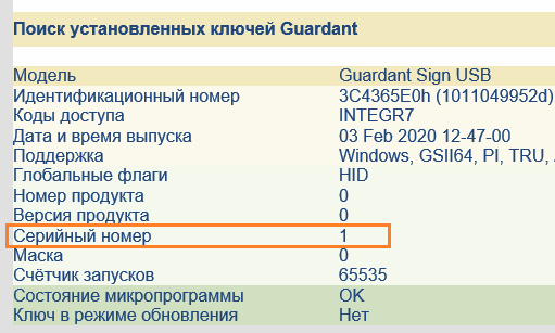 ПУСК → Панель управления (вид просмотра: значки) → Драйверы Guardant → кнопка «Диагностика» → кнопка «Полный отчёт» → число в поле «Серийный номер»).